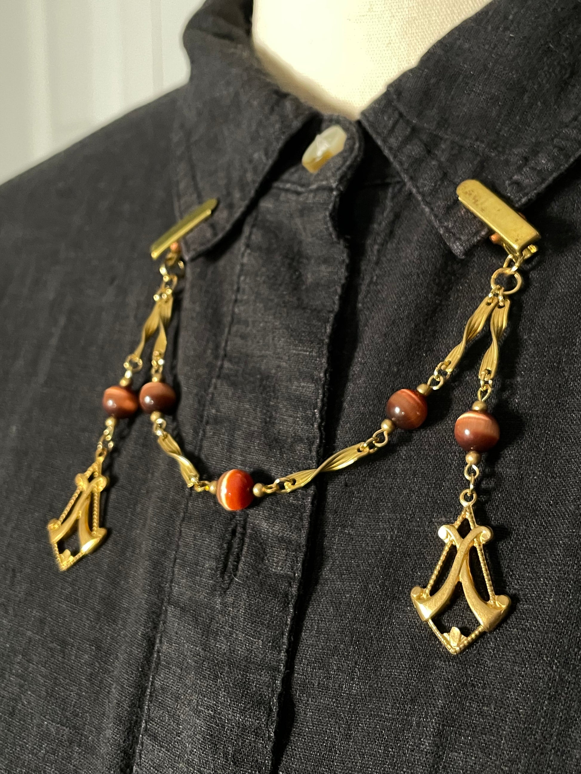 goldtone collar clips mare from twisted brass links, brown beads, and deco charms.