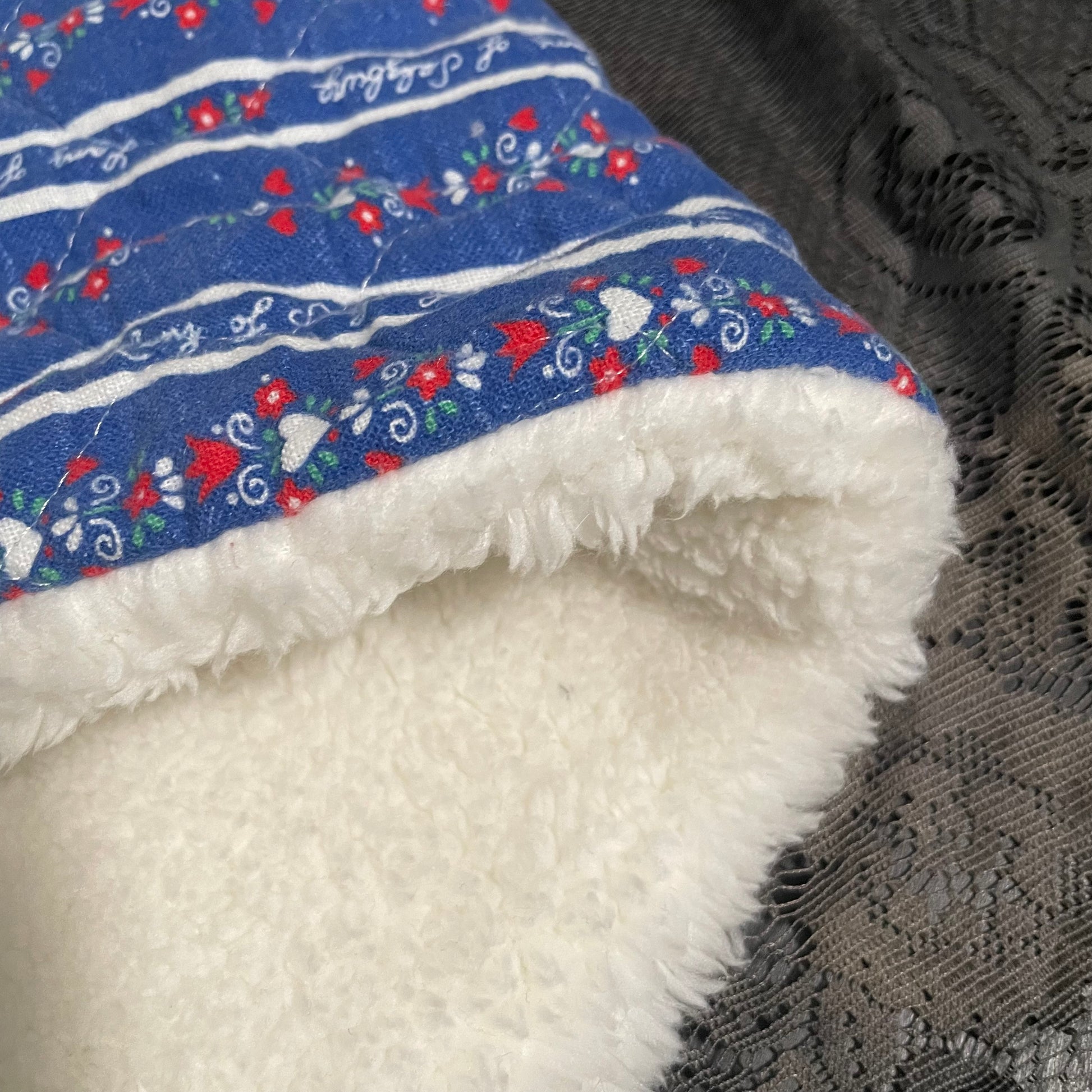 Cozy faux sherpa with a soft quilted fabric that was reclaimed from a vintage Lanz of Salzburg house robe. Can be worn on the head, or around the neck as a neck warmer/neck scarf. Very warm and cozy!