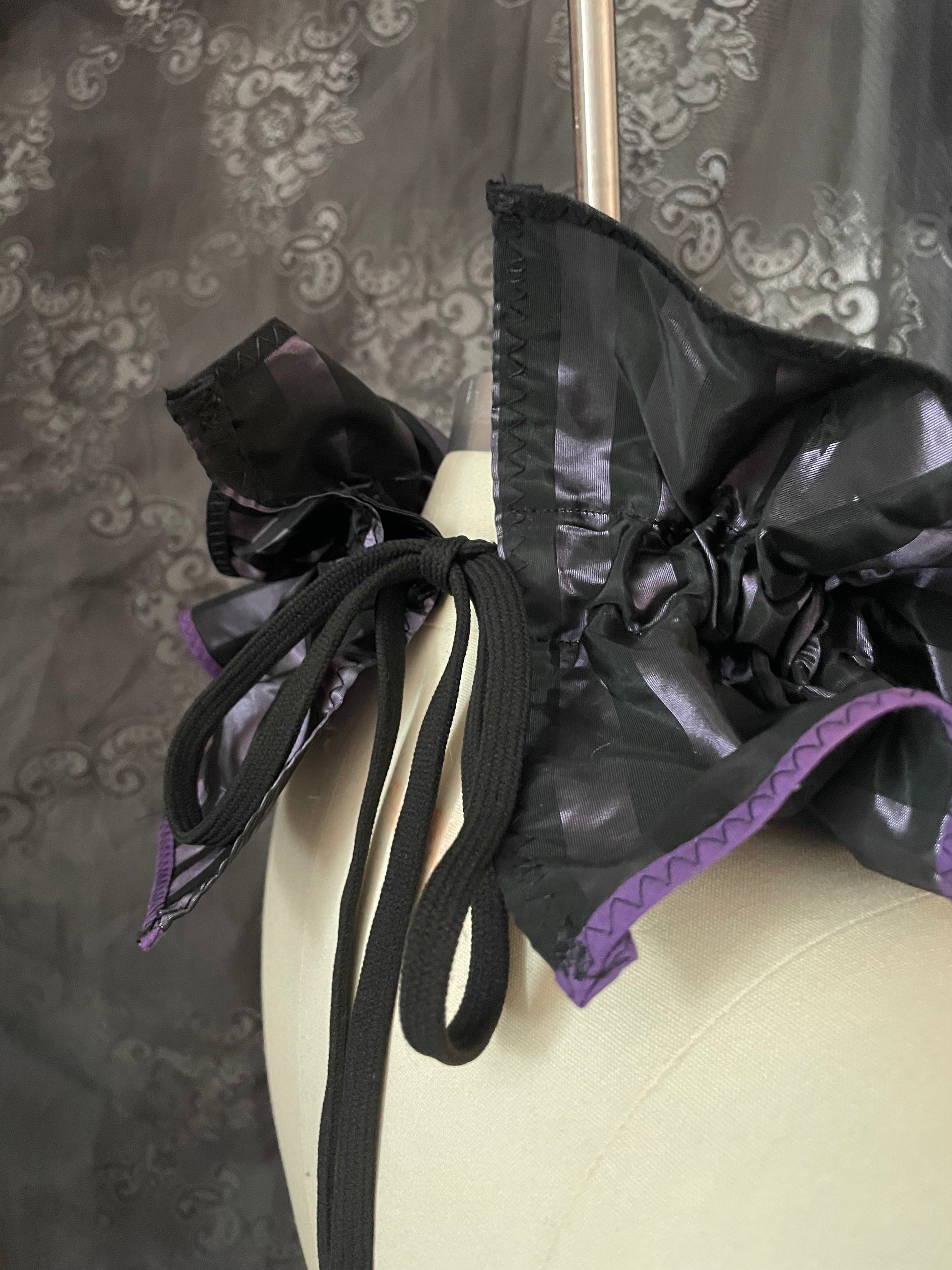 Adjustable Ruffle Collar made with vintage fabric. Features a grosgrain ribbon tunnel with a tubular drawcord. Cord is a little stretchy & has plastic short cord-enders. 8” height & 52” drawcord.