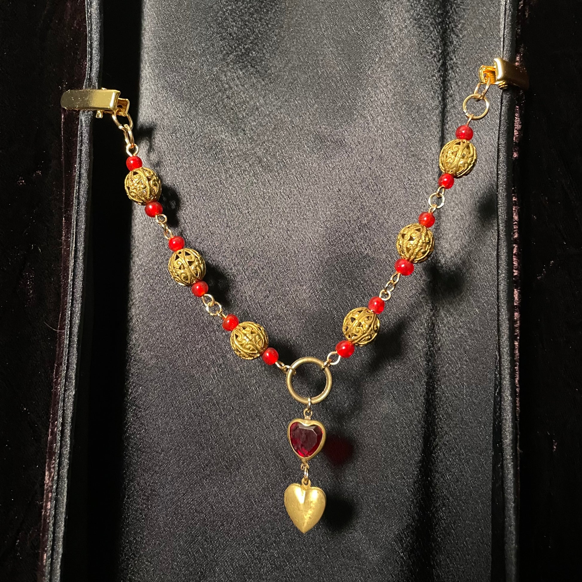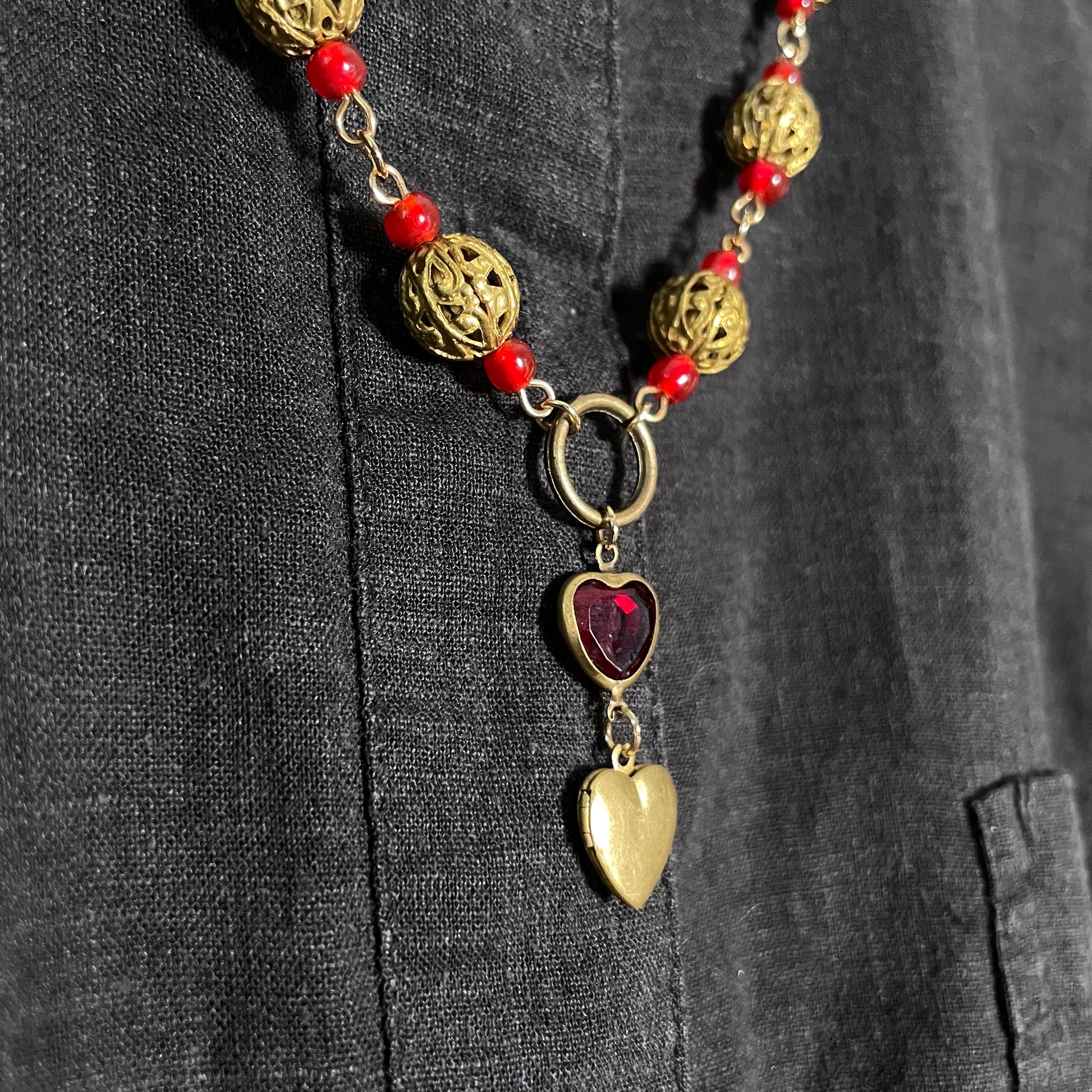 goldtone collar clip made from vintage filigree beads & a heart shape connector with a raw brass locket.